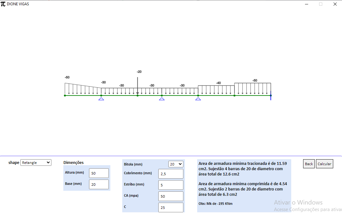 Software inspirado no já conhecido f-tool, porém CALC VIGAS focado em apenas vigas. Assim o usuário inserindo os esforços na viga, com o software se encarregando de fazer todos os cálculos complexos de esforços de momento e cisalhamento, assim desenhando seus respectivos diagramas. Também calculando a área mínima de aço da armadura que possa suportar tais características e até sugerindo uma combinação de bitolas aonde o usuário pode fazer seus ajustes e automaticamente o software o-recalcula. Poém o calculo das armaduras apenas se limita as vigas de seção retangular/quadrada. O Programa realiza calculos não de apenas 2 apoios mais de quantos mais apoios forem necessários, pois executa calculos com a técnica de vigas hiperestáticas e equações lineares quando necessário. Assim salvando o usuário de mais de 30 folhas de cálculos dependendo da complexidade em apenas frações de segundos. No vídeo acima resolvo vários exercícios no YouTube em frações de segundo usando o software.